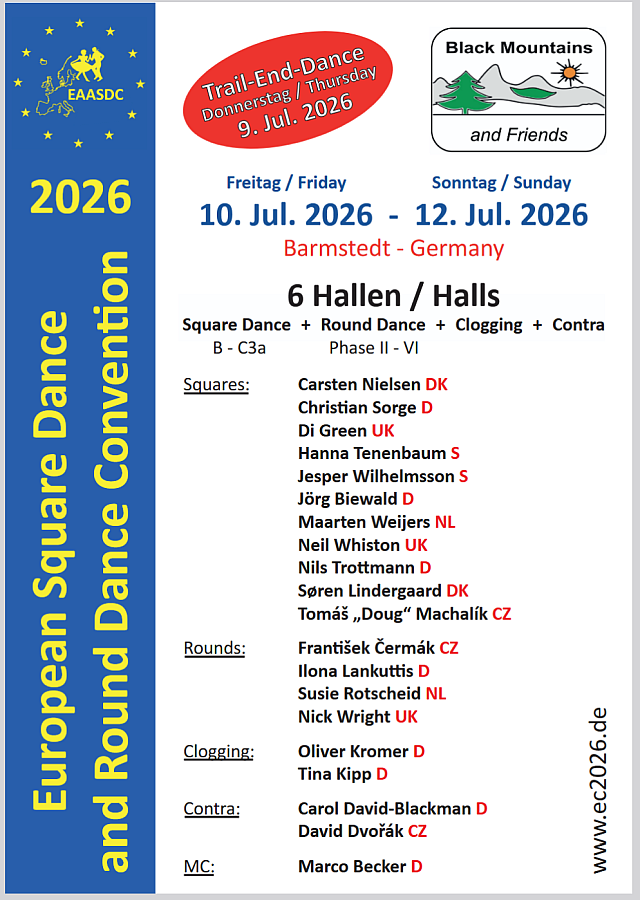 Auf dem Square Dance Programm stehen Caller aus 6 verschiedenen europäischen Ländern, die alle gängigen Level von Basic bis C3a callen.