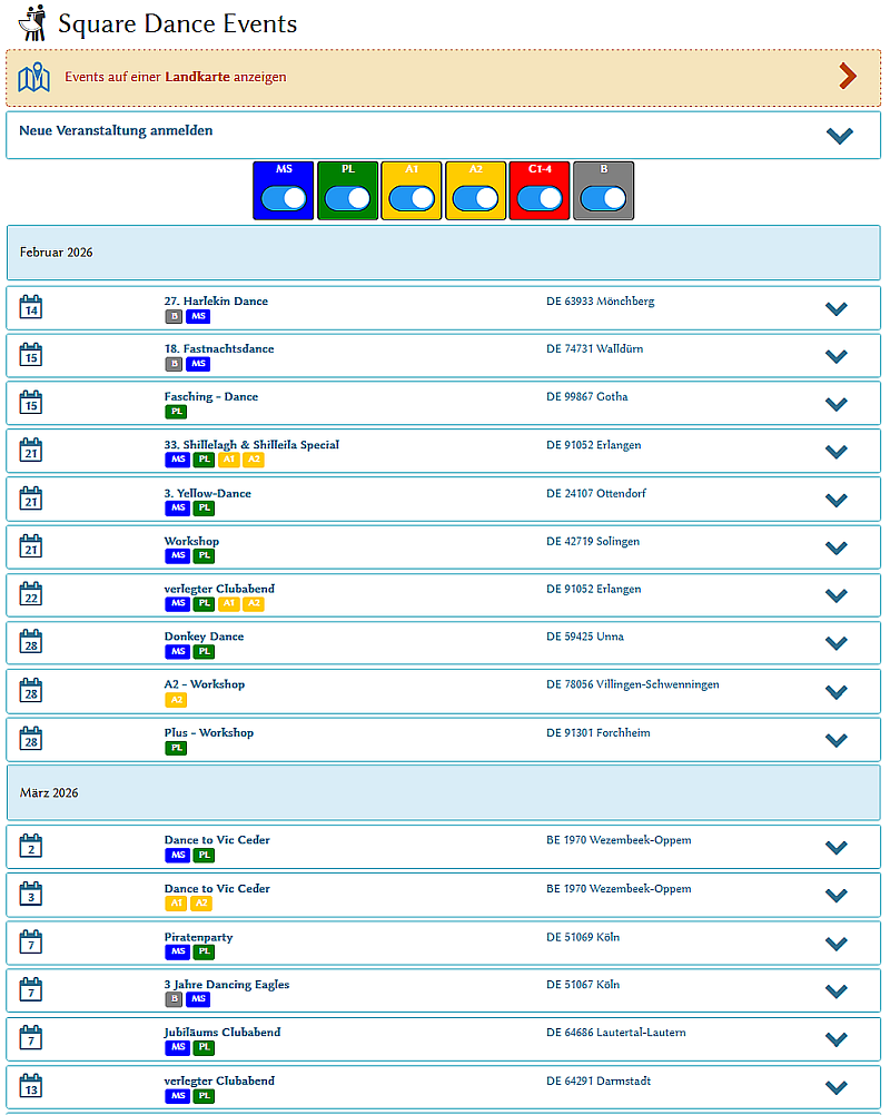 Weitere Square Dance Events findet ihr im Event-Kalender – sortiert nach Datum. Klappt einfach in der Zeile über den Pfeil nach unten weitere Informations auf. Dort findet ihr auch die jeweiligen Flyer der Veranstaltungen.