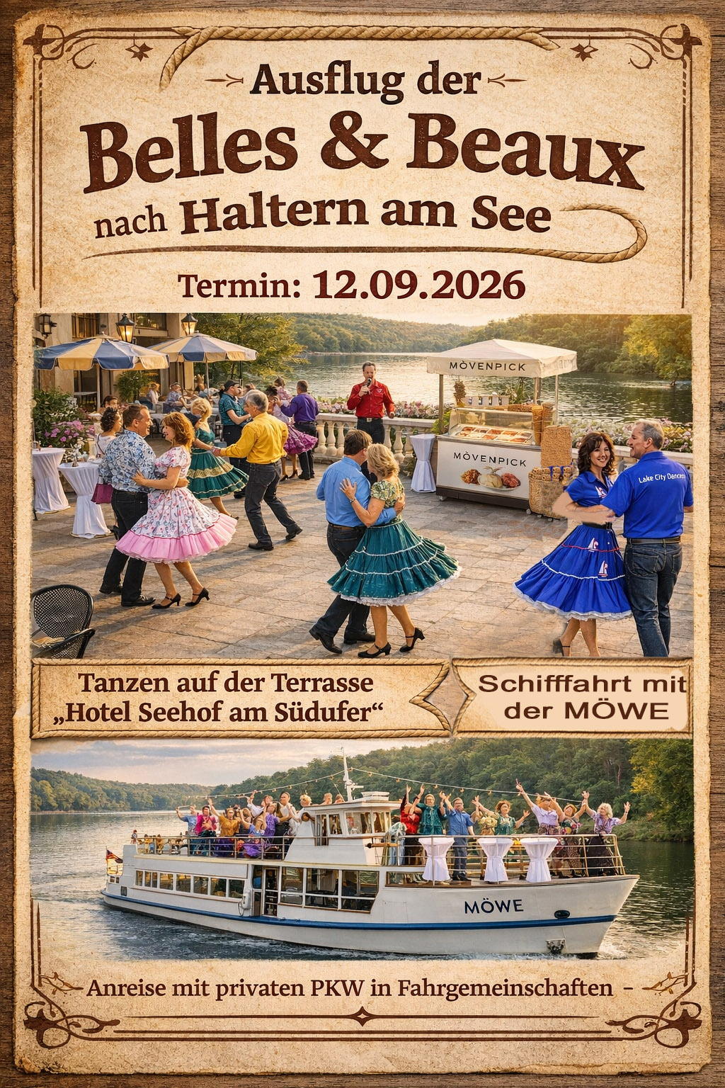 Ankündigung: Wir planen einen Ausflug nach Haltern am See. Dort wollen wir eine Rundfahrt mit dem Ausflugsschiff „Möwe“ über den See machen. Anschließend treffen wir uns mit den Tänzern der „Lake City Dancers“ auf der Terasse des Hotels „Seehof“ zum Tanzen. Caller ist Wolfgang Haehnel.